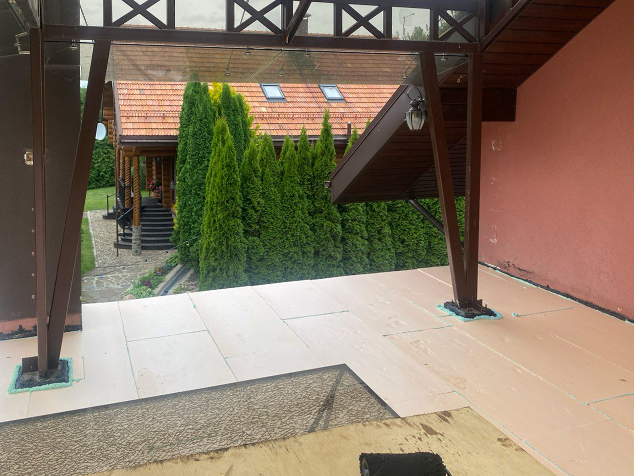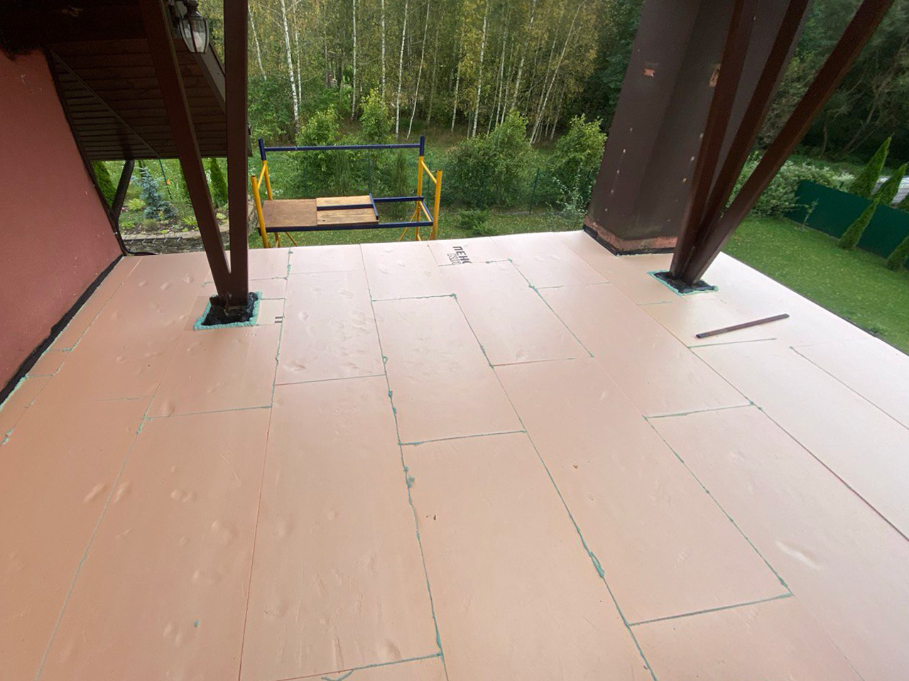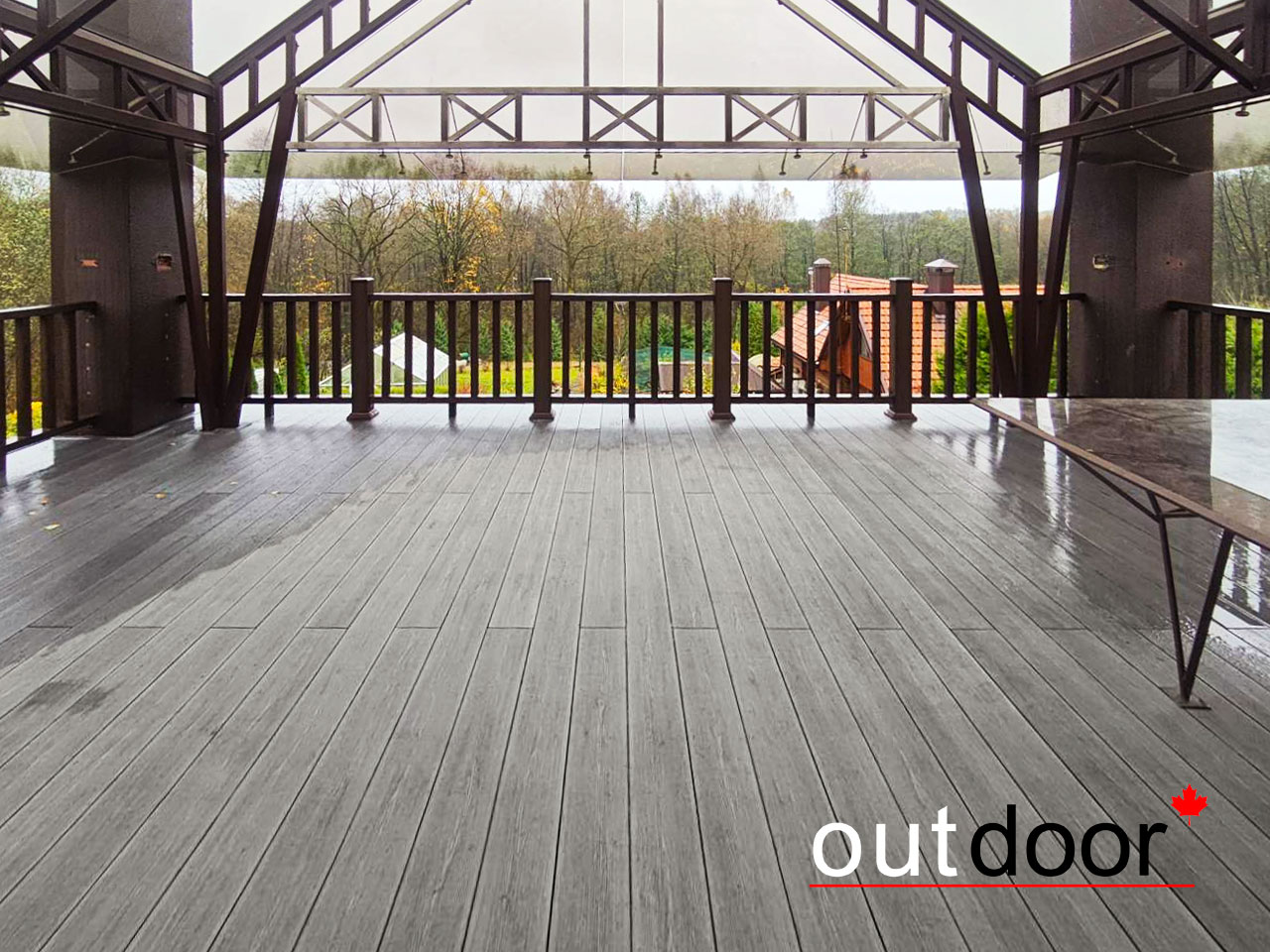 Построить в загородном доме террасу на регулируемых опорах и ограждения из древесно-полимерного композита.