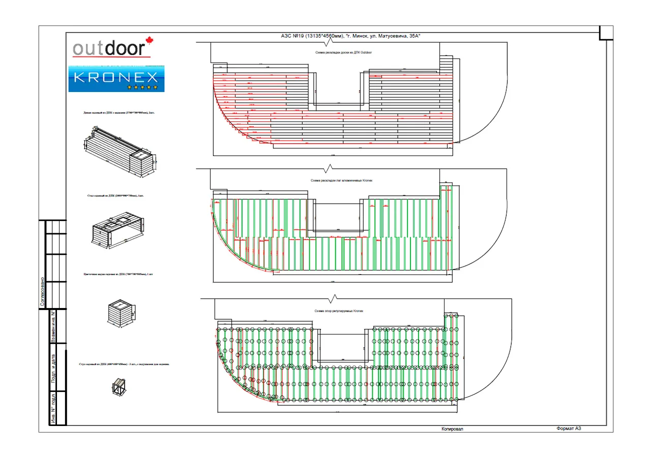 Обустроить настил, цветочные кадки, стол, диван и стулья из материалов ДПК на террасе летнего кафе при АЗС.