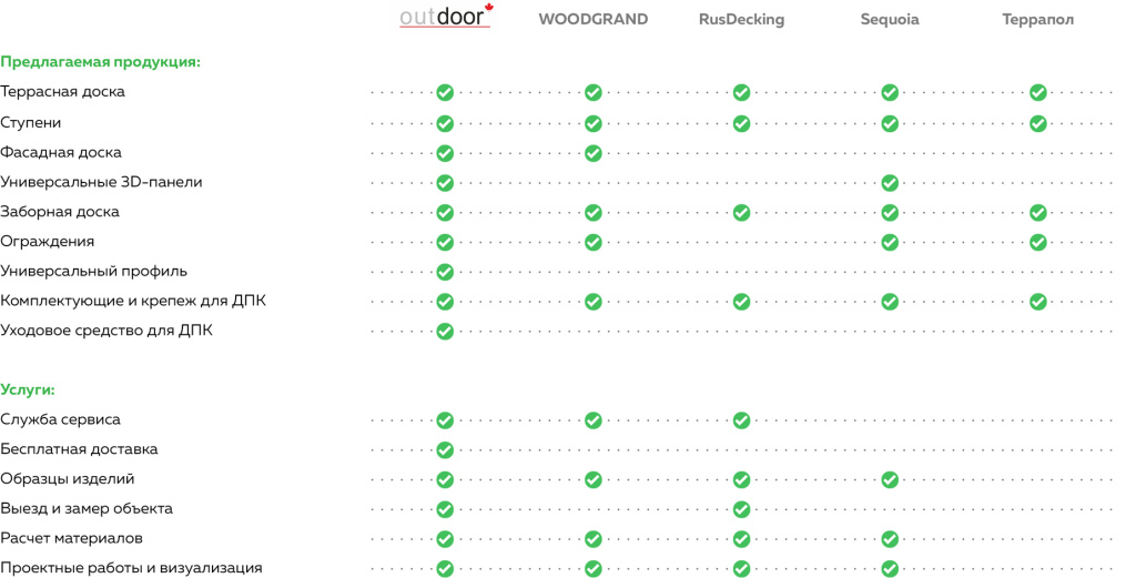 В каталоге интернет-магазина kronex-home.ru представлен широкий ассортимент материалов из ДПК бренда Outdoor различной текстуры и цвета, среди которых террасная доска, заборная и фасадная доска, универсальные реечные панели, композитные ограждения, универсальный профиль, а также керамогранитная плитка, садовая мебель для террасы и многое другое.
